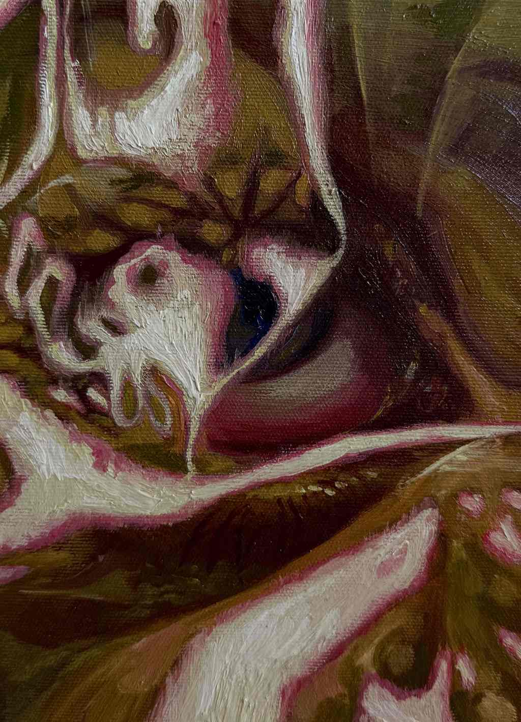 Obraz będący częścią mojego dyplomu magisterskiego pt. „Wszystko co widzę w swoich oczach. Tylko nie wiem czy chcę”. Obrazy te są wizualną interpretacją stanów emocjonalnych. Koncentruje się na doświadczeniach trudnych i mocnych odczuciach. Mimo, że każdy obraz był inspirowany moimi własnymi przeżyciami to intencją pozostaje otwarcie przestrzeni na uniwersalne doświadczenia odbiorców.